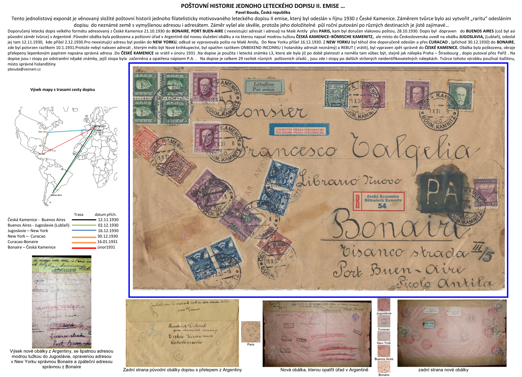 Zameranie exponátu: Poštovo-historické spracovanie a rekonštrukcia zaujímavému polročného putovania doporučenej leteckej celistvosti s II. emisiou československých leteckých známok v rokoch 1930 a 1931.
