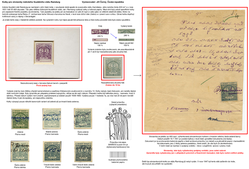 Zameranie exponátu: Teritoriálne špecializované spracovanie kolkov na úhradu poplatkov za potvrdenky indického feudálneho štátu Ramdurg v období roko 1936 - 1943.