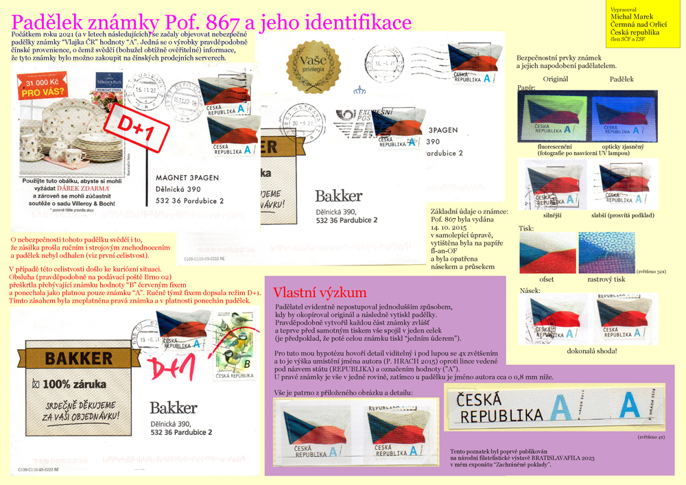 Jednostranový exponát Padělek známky Pof. 867 a jeho identifikace, formát A3 na ležato (landscape).