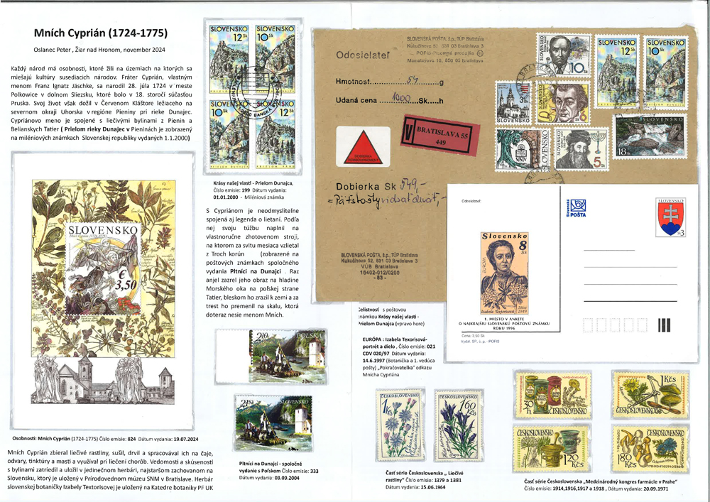 Zameranie exponátu: Tematické spracovanie založené na slovenskej poštovej známke z roku 2024 (Kat. číslo 824) - Osobnosti: Mních Cyprián (1724 - 1775) - 300. výročie narodenia.