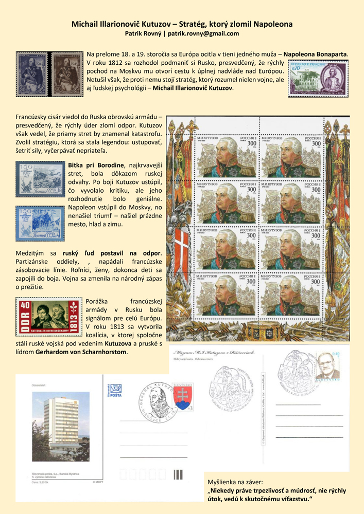 Jednostranový exponát Michail Illarionovič Kutuzov - Stratég, ktorý zlomil Napoleona, formát A3 na stojato (portrait).