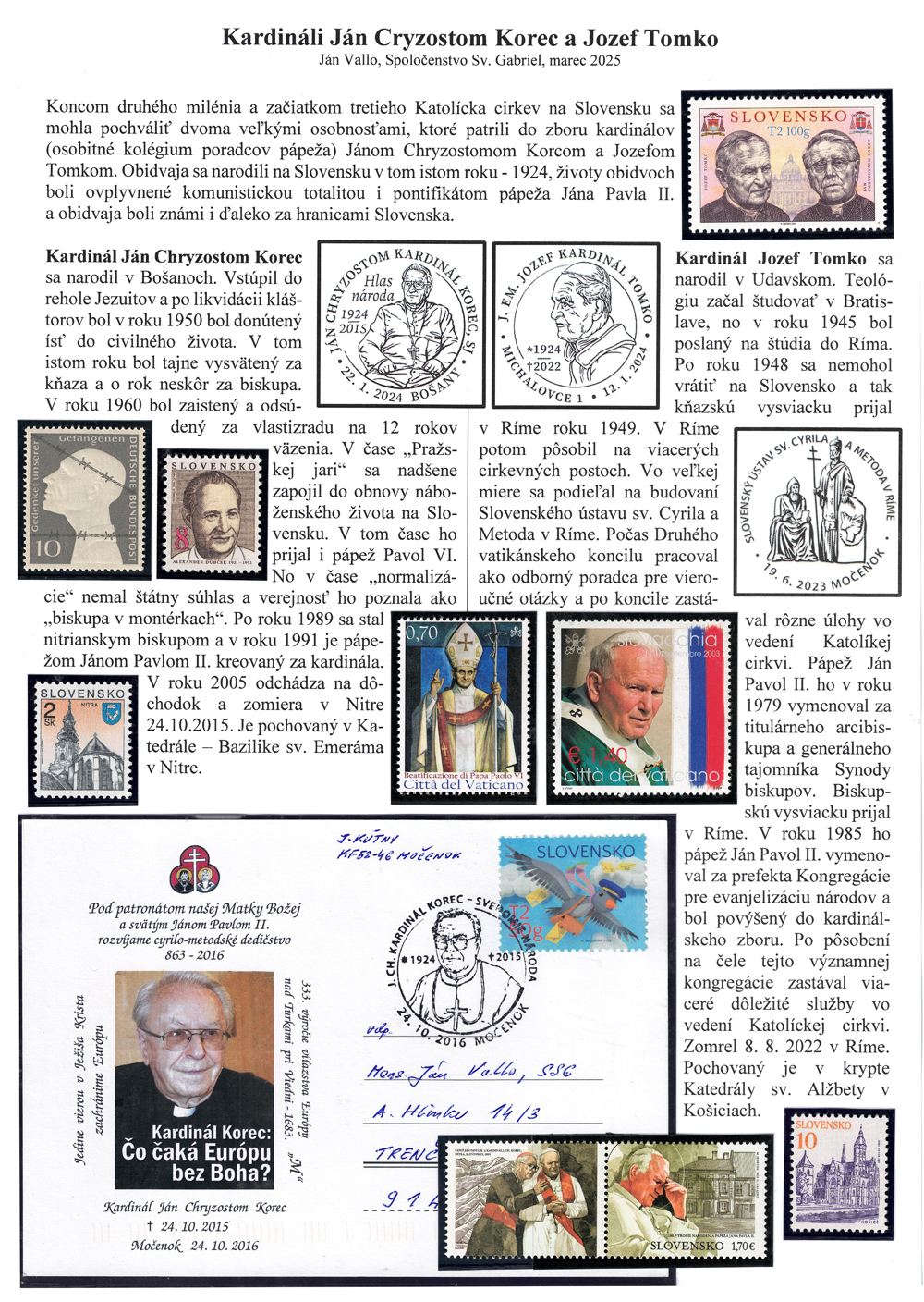 Zameranie exponátu: Tematické spracovanie založené na slovenskej poštovej známke z roku 2024 (Kat. číslo 810) - Osobnosti: Ján Chryzostom Korec (1924 – 2015) a Jozef Tomko (1924 – 2022) - 100. výročie narodenia.