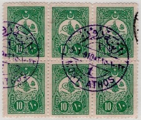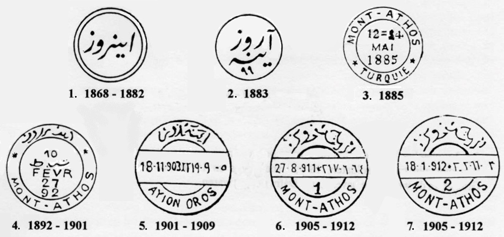Na Athose sa na frankovanie používali bežné osmanské známky, ktoré boli v období 1868-82 znehodnocované dvojkruhovou pečiatkou (č. 1) s nápisom v arabskom písme AYNAROS (AYNOROS alebo AYON-OROS = Svätá hora).