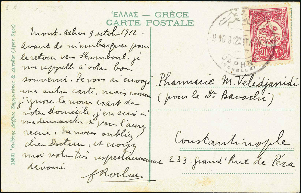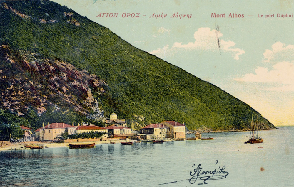 Gréci sa vylodili na Athose v Dafni 2. novembra a osmanská posádka sa okamžite vzdala. Hneď v ten deň prevzal poštovú službu grécky námorný oddiel, ktorý používal pečiatky s nápisom ΝΑΥΤΙΚΟ ΑΓΗΜΑ (Námorné sily).