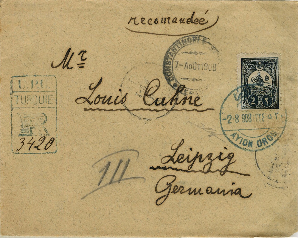 Doporučený list poslaný 2. augusta 1908 do Lipska v Nemecku,