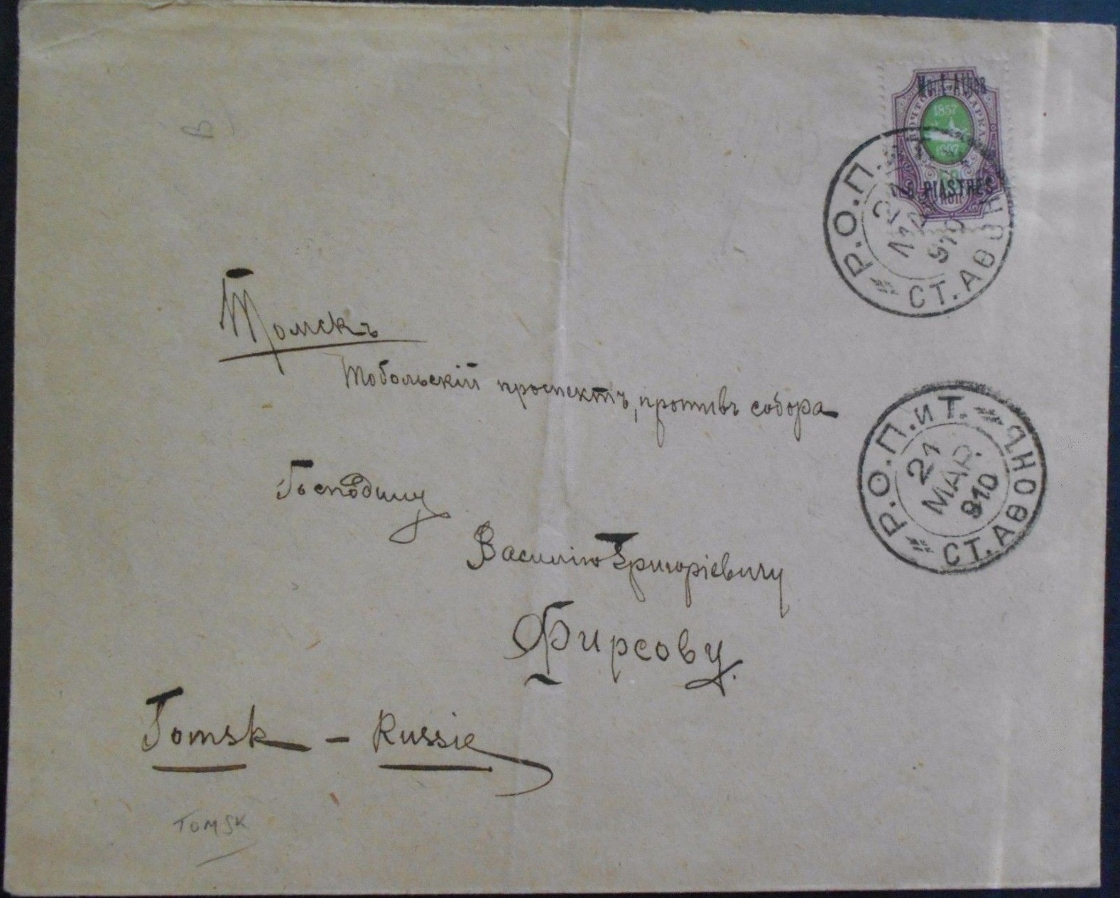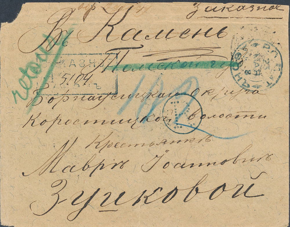 Doporučený list poslaný 23. mája 1898 z Mont Athos do Kameňu (Kaмeнь) v Tomskej gubernii,