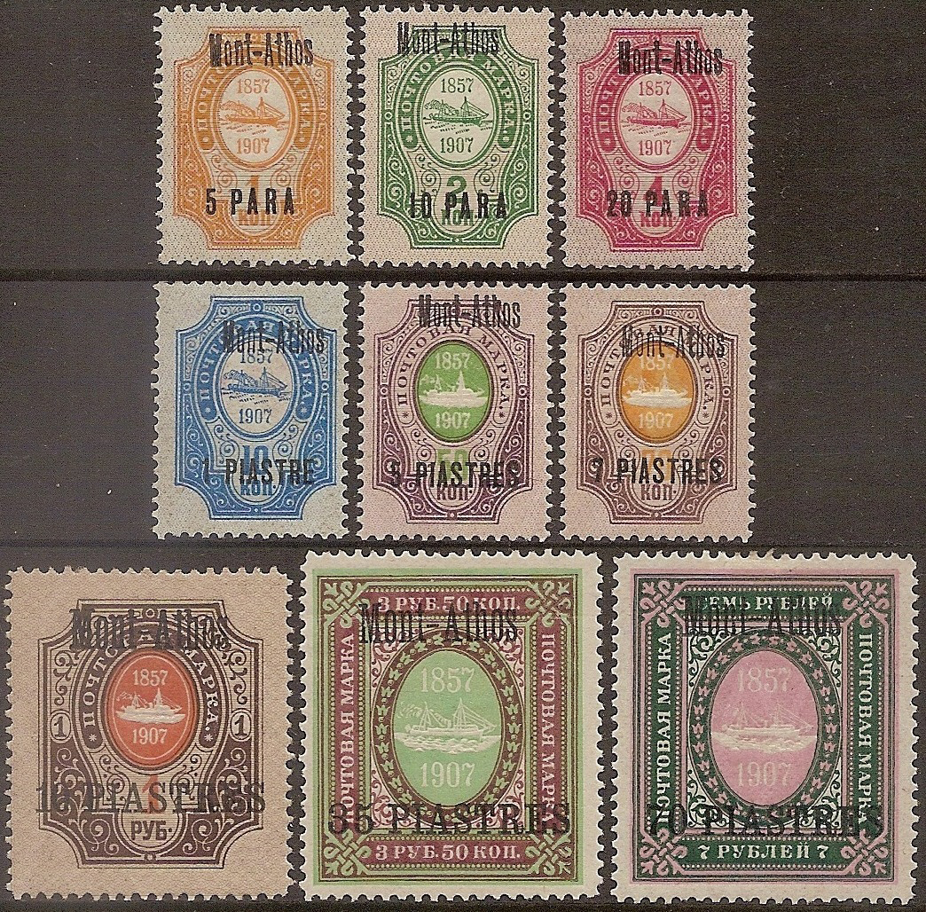 V novembri 1909 bolo vydaných deväť známok s nápisom „Mont-Athos“.