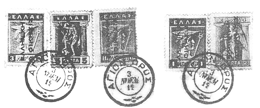 Tieto pošty spočiatku, rovnako ako všetky ostatné na dobytých územiach, používali grécke známky s pretlačou ΕΛΛΗΝΙΚΗ ΔΙΟΙΚΗΣΙΣ a neskôr definitívne s textom ΕΚΣΤΡΑΤΕΙΑ 1912 (emisia Kampaň).