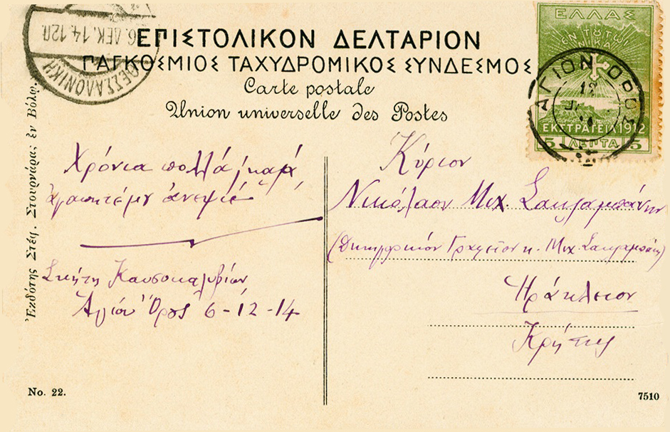 Pohľadnica poslaná 6. decembra 1914 do Heraklionu na Kréte,