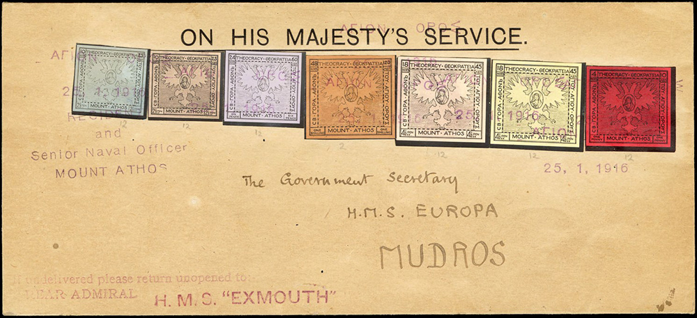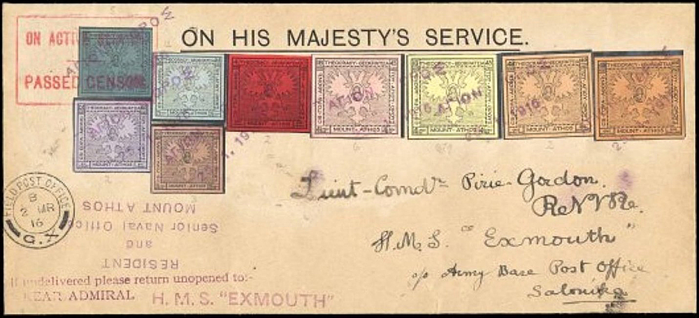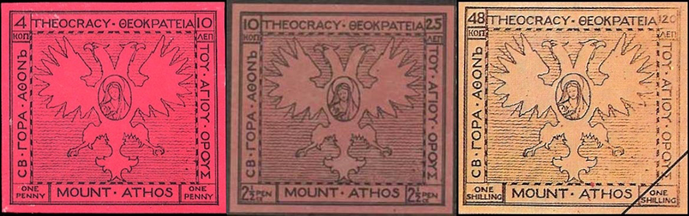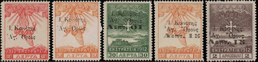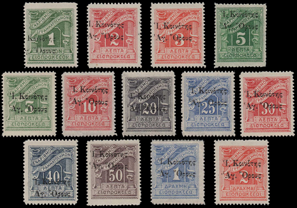 Na upevnenie pozície sa preto grécka vláda rozhodla z diplomatických dôvodov vydať v roku 1916 pretlačovú emisiu s nápisom „Ι. Κοινότης Αγ. Όρους“ (Sväté spoločenstvo Svätej hory). Na pretlač boli použité doplatné známky, známky zo série Kampaň a takisto poštové celiny.