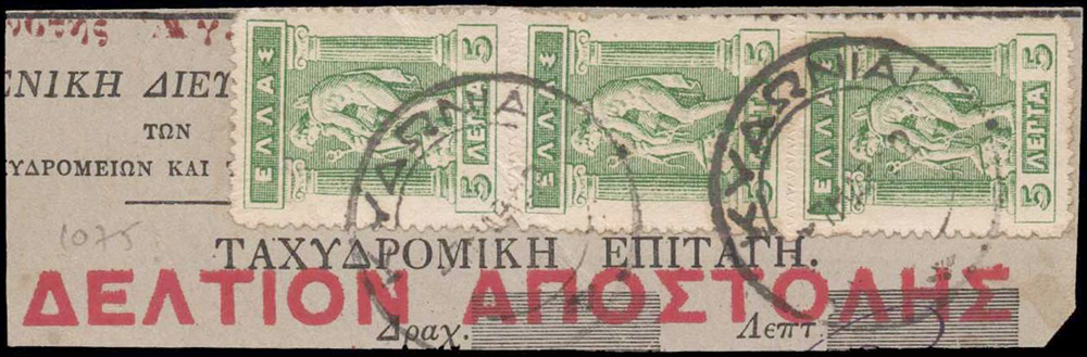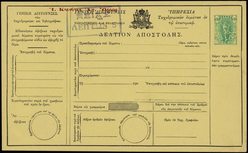Poštová poukážka v ľavom hornom rohu s časťou červenej pretlače Ι. Κοινότης Αγ. Όρους,