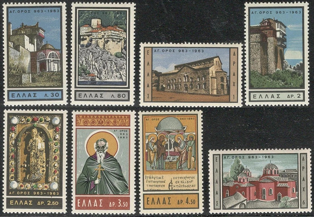 Na miléniové výročie založenia prvého kláštora vydala grécka správa 5. decembra 1963 pamätnú emisiu známok zobrazujúcich niekoľko kláštorov a pamätihodností Mont Athosu.